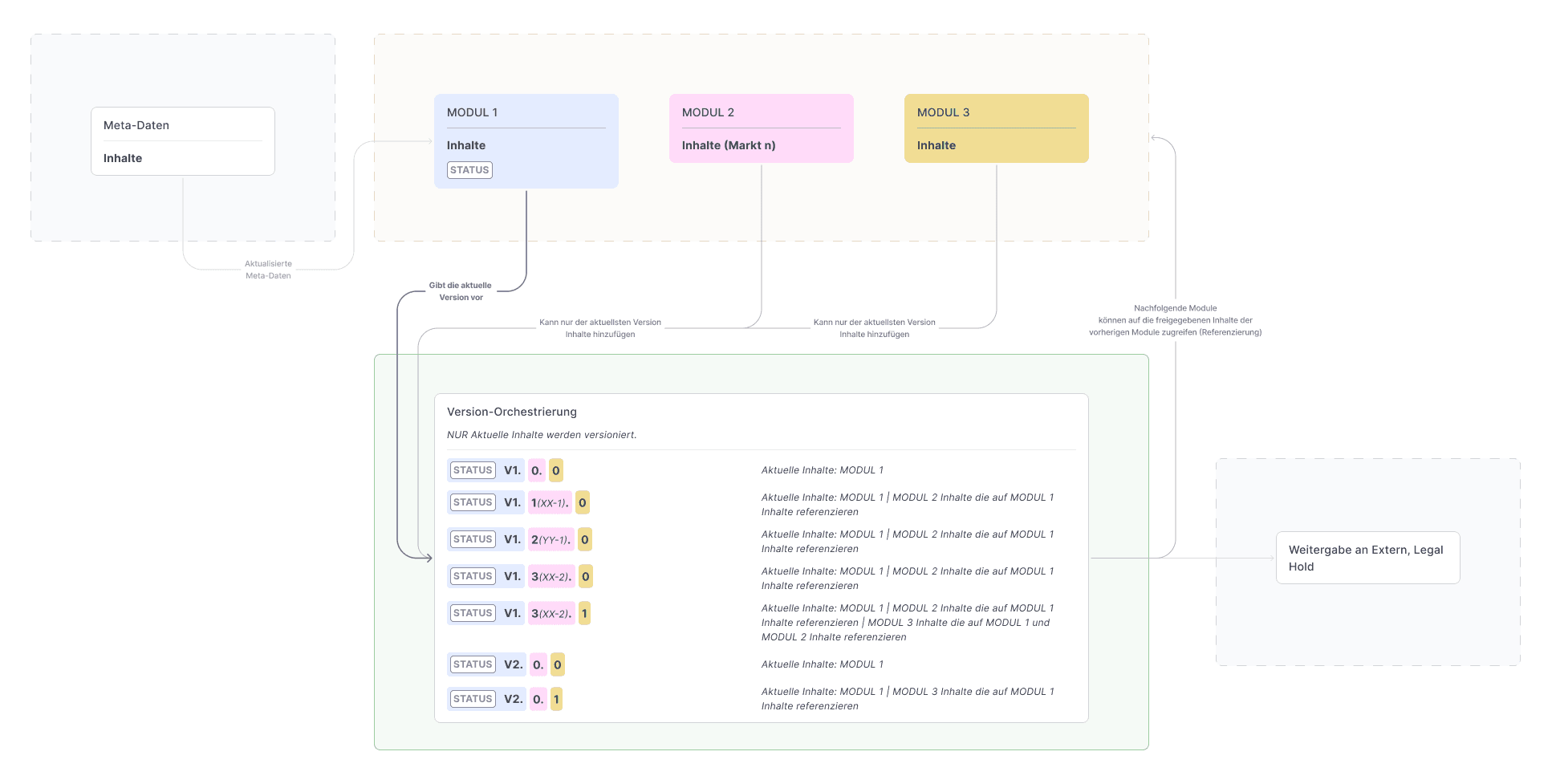 Skalierbare Modulstruktur: Die Versionierungslogik funktioniert unabhängig davon, wie viele Module künftig hinzukommen — die Referenzierungslogik bleibt konsistent.