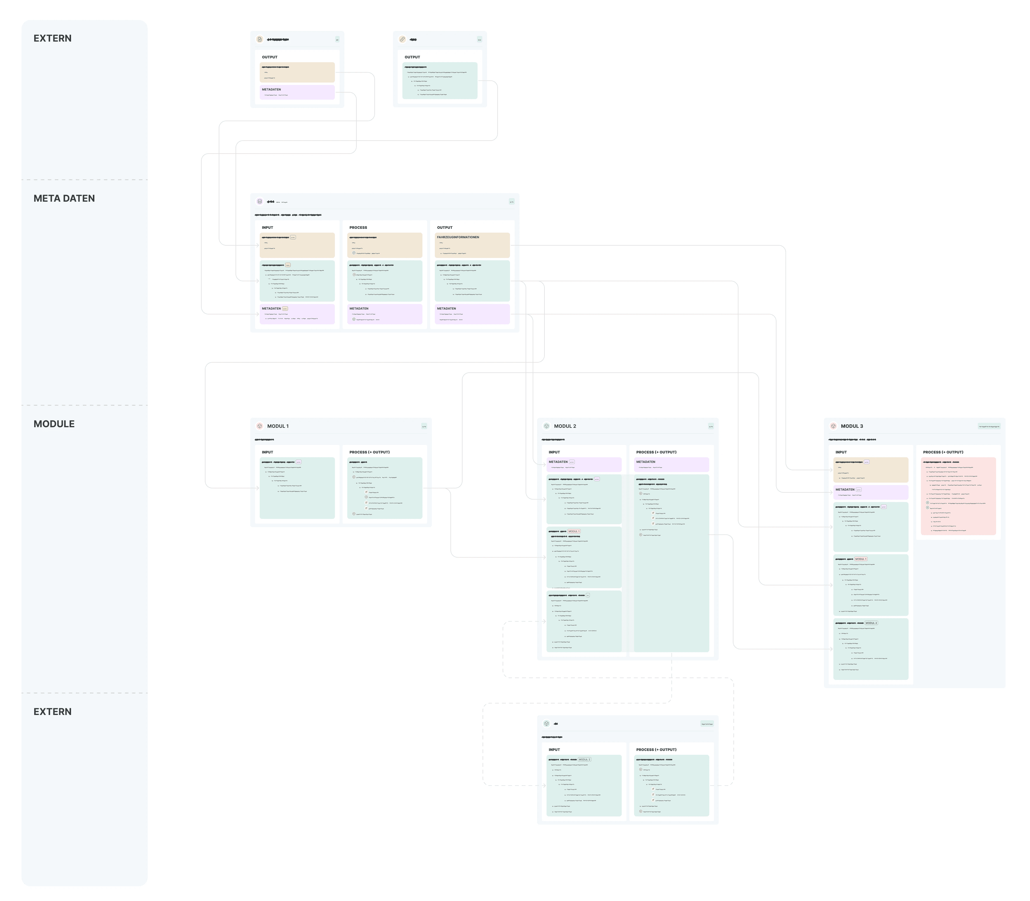 Systemarchitektur: Datenfluss über vier Ebenen — Extern (Input und Datenimport), Meta-Daten und Module. Modul 1–3 zeigen Input-, Process- und Output-Strukturen mit jeweiligen Metadaten-Schichten.